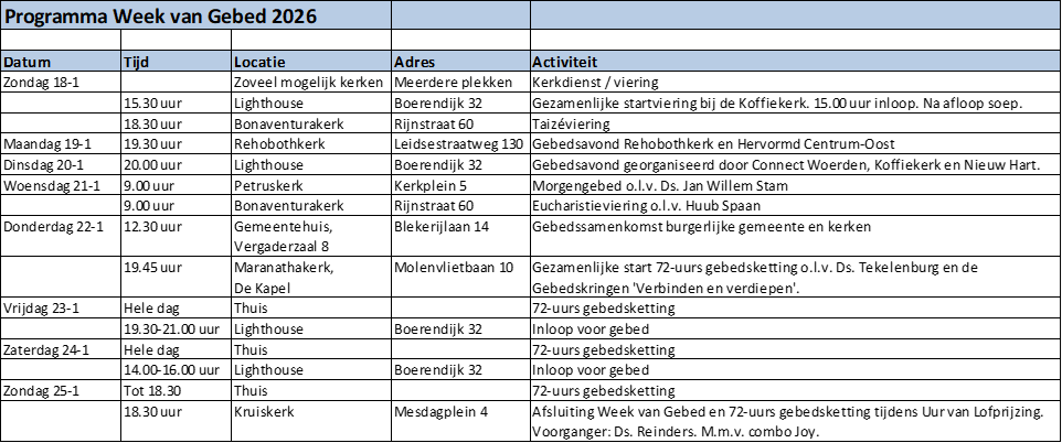 Er zijn tijdens de WvG vele samenkomsten, waarbij we op verschillende manier vieren, lezen, zingen, danken en bidden. In januari wordt het programma via meerdere kanalen verspreid. We hopen dat deze WvG ertoe mag leiden dat we elkaar ontmoeten tot eer van God en dat het onze beleving dat we één zijn in Christus door Gods Geest mag bevestigen en versterken.
